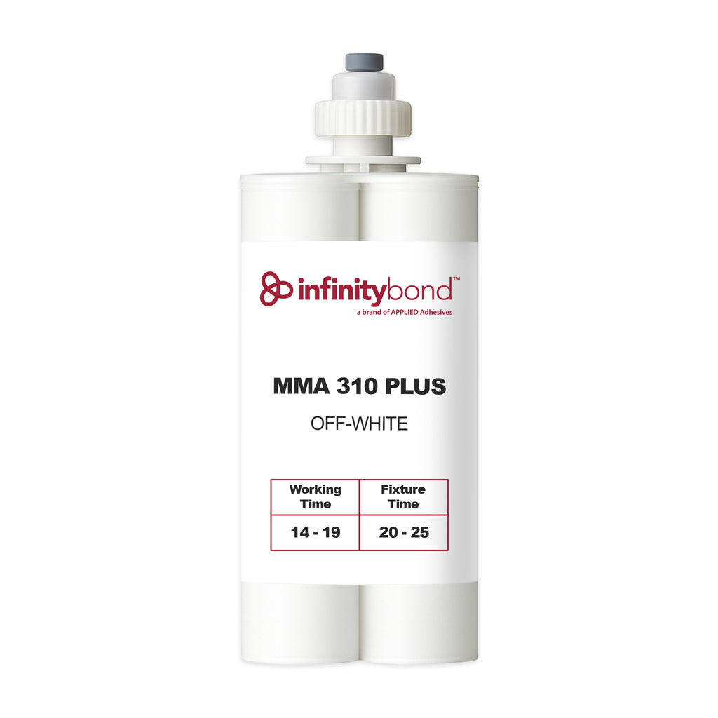 Infinity Bond MMA 310 is a high-strength, structural methyl methacrylate adhesive (MMA) designed for bonding difficult substrates, including fiberglass, steel, aluminum, and various plastics (excluding low-energy surfaces). It features a 1:1 mix ratio, an 14 to 19-minute working time, and an 20 to 25-minute fixture time, providing strong, permanent bonds with minimal surface preparation.