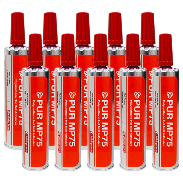The Infinity PUR MP75 is a high performance polyurethane hot melt that bonds to a wide range of substrates. It offers a longer open time - around 75 seconds - giving users ample time to set their substrates or bond larger surfaces before the adhesive sets. MP75 can be used to bond wood, metal, plastics, cement, ceramic and more.