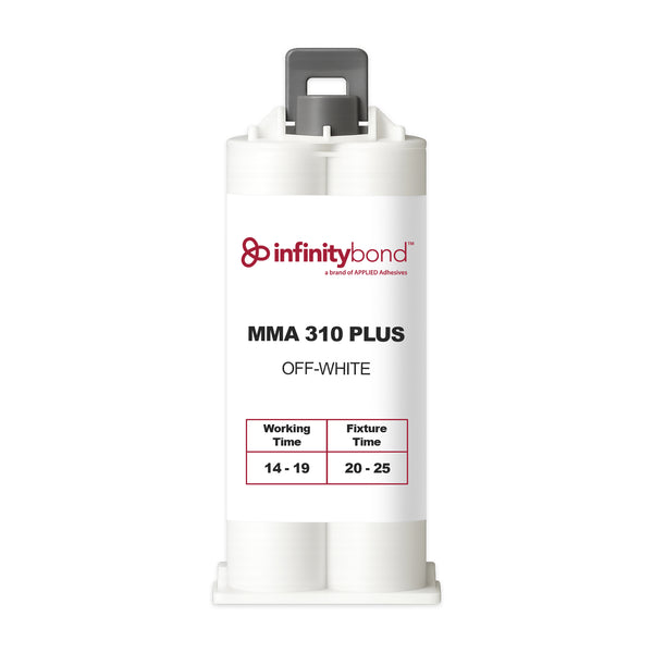 Infinity Bond MMA 310 is a high-strength, structural methyl methacrylate adhesive (MMA) designed for bonding difficult substrates, including fiberglass, steel, aluminum, and various plastics (excluding low-energy surfaces). It features a 1:1 mix ratio, an 14 to 19-minute working time, and an 20 to 25-minute fixture time, providing strong, permanent bonds with minimal surface preparation.
